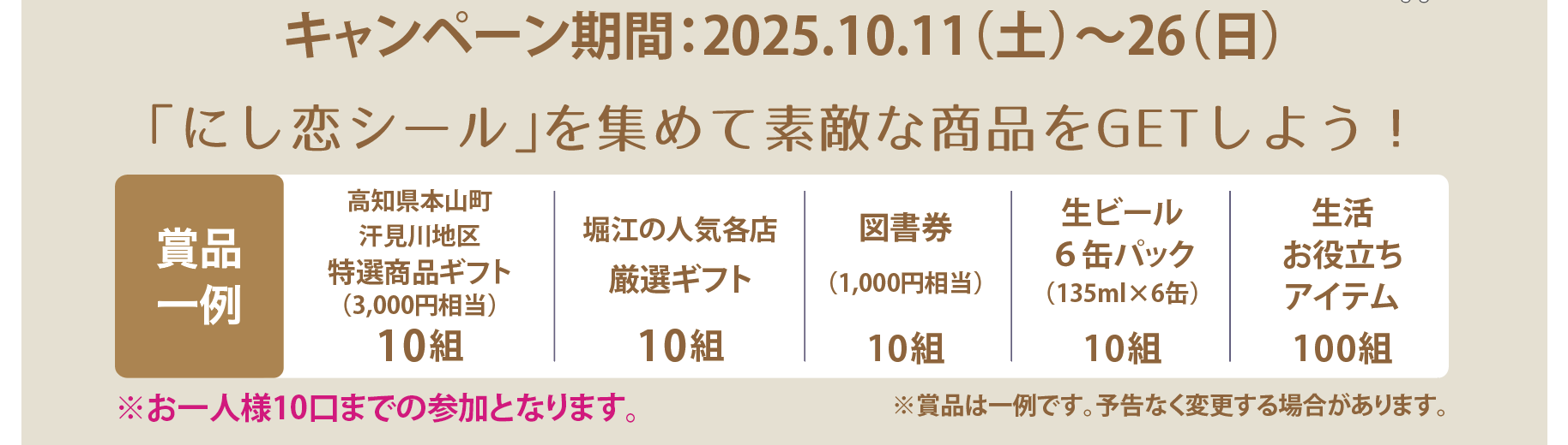 キャンペーン実施店舗で1,000円以上のお買い上げのレシートを、店頭またはサービスカ ウンターでご提示いただくと、「にし恋シール」を1,000円につき1枚さし上げます。応募用 紙にシールを5枚集めて「にし恋マルシェvol.12」当日の10月26日(日)に高台橋公園(西 区南堀江3-1)にお持ちください。5枚1口で抽選会にご参加いただけます。